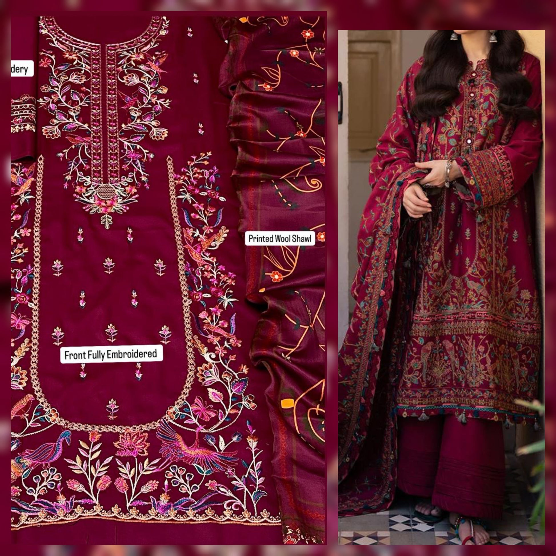 Stay warm and stylish this season with our Fine Quality Dhanak 100×100 3-piece suit, designed with rich embroidery and paired with a soft digital printed wool shawl. Perfect for winter gatherings, casual wear, and festive occasions.